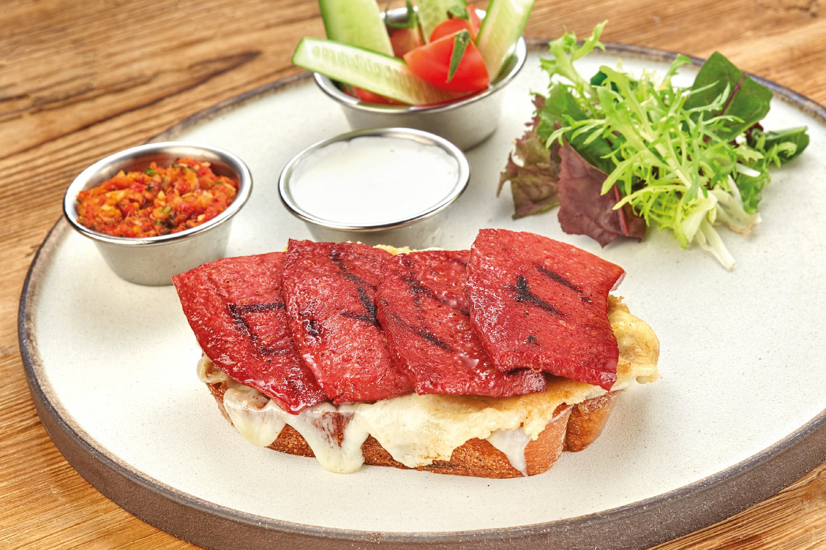 (Kızarmış tahıllı ekmek üstü kars kaşarı, ızgara sucuk, romesco ve sauri krem sos ile)
