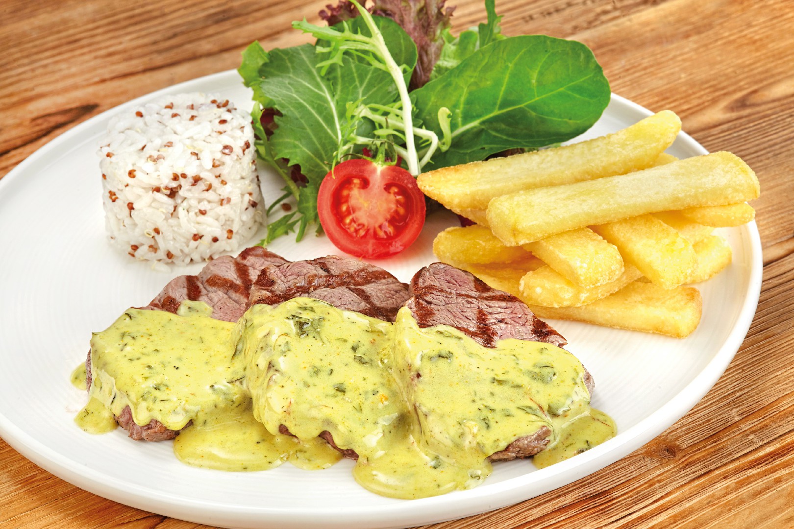 (Jülyen biftek parçaları, mantar, taze fesleğen, light soya sos, krema ve parmesan ile)