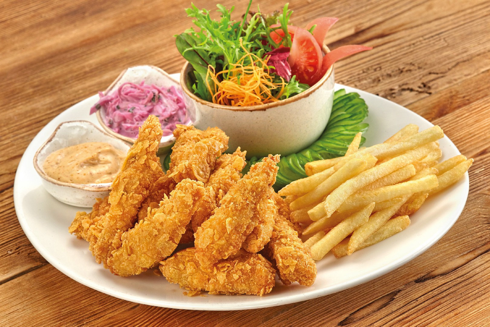 (Taze baharatlar ile marine edilmiş panko paneli çıtır tavuk parçaları, kızarmış patates, coleslaw ve baharatlı mayonez sos ile)