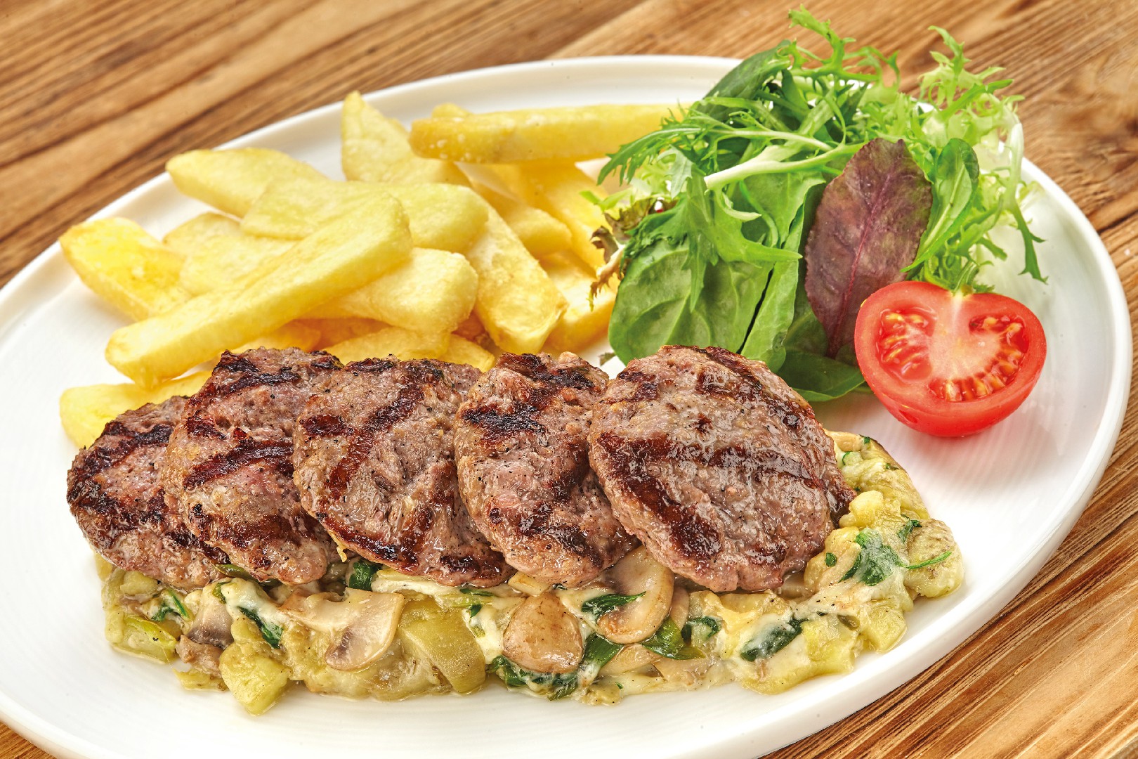 (Ev yapımı köfte, kornişon turşu, çıtır saman patates, jalapeno, karamelize soğan, acı louisiana soğan, coleslaw kızarmış patates)