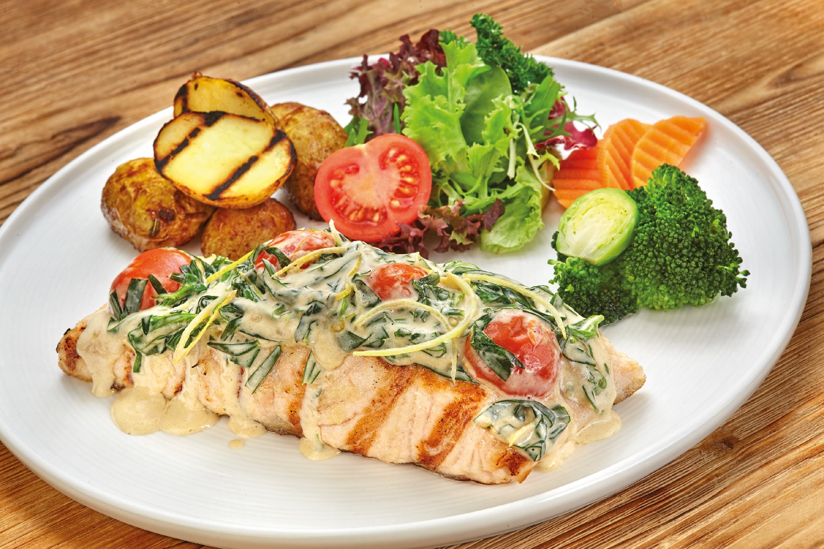(Izgara somon üzerinde taze tarhun, cherry domates, limon kabuğu, hafif krema)