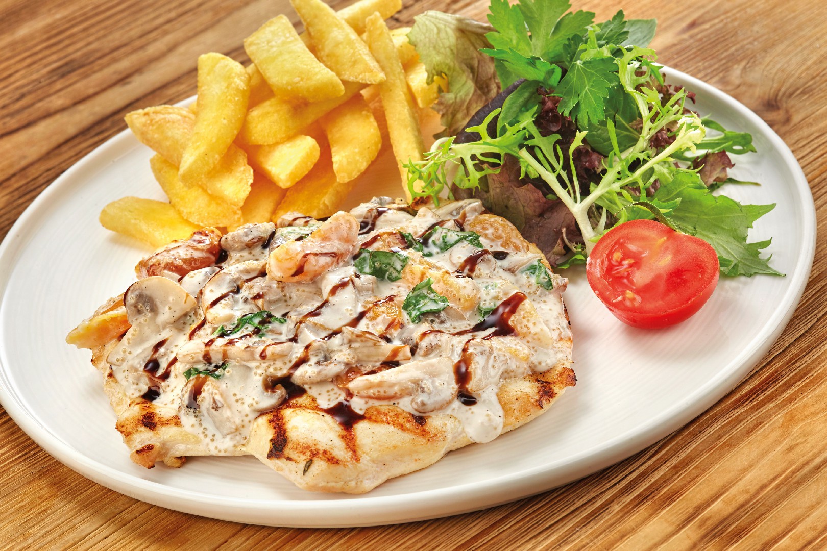 (Jülyen tavuk parçaları, mantar, taze fesleğen, light soya sos, krema ve parmesan ile)