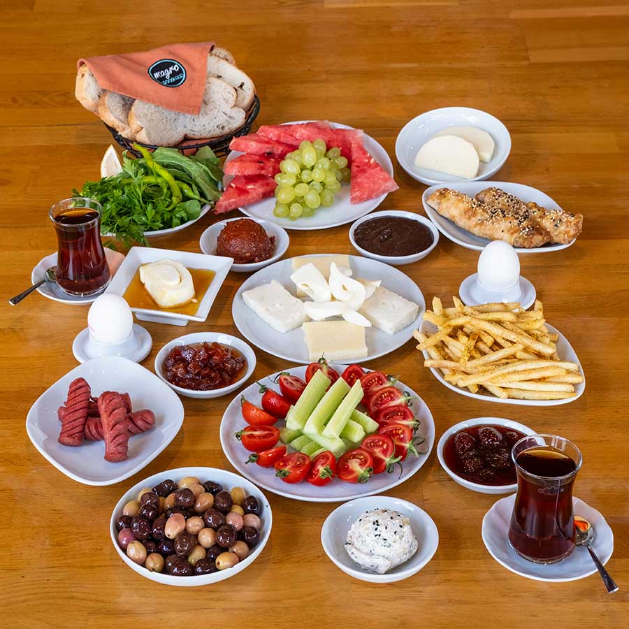 (Kahvaltımız en az iki kişilik servis edilmektedir.) Cherry Domates Salatalık Söğüş, Yeşil Zeytin, Siyah Zeytin, Tereyağ, Ezine Beyaz Peynir, İzmir Tulum Peynir, Örgü Peyniri, Bal, Kaymak, Çilek Reçeli, Ayva Reçeli, Acuka, Sosis Tava, Peynir Ezmesi, Yeşil Biber, Karpuz, Üzüm, Sigara Böreği, Pişi, Şakşuka, Sahanda Yumurta, Ekmek Çeşitleri, Sınırsız Çay)