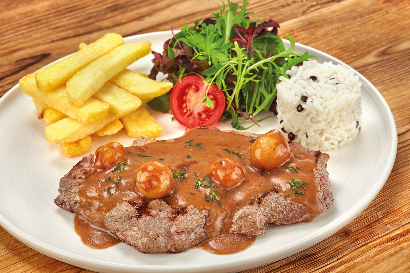 (Izgara biftek üzerinde soğan, tane karabiber, mantar, demi glace sos)