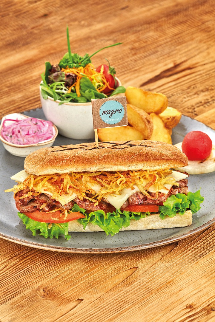 (Panini ekmeği içinde ızgara biftek parçaları, kaşar, çıtır kibrit patates, marul, domates, kızarmış patates ve coleslaw)