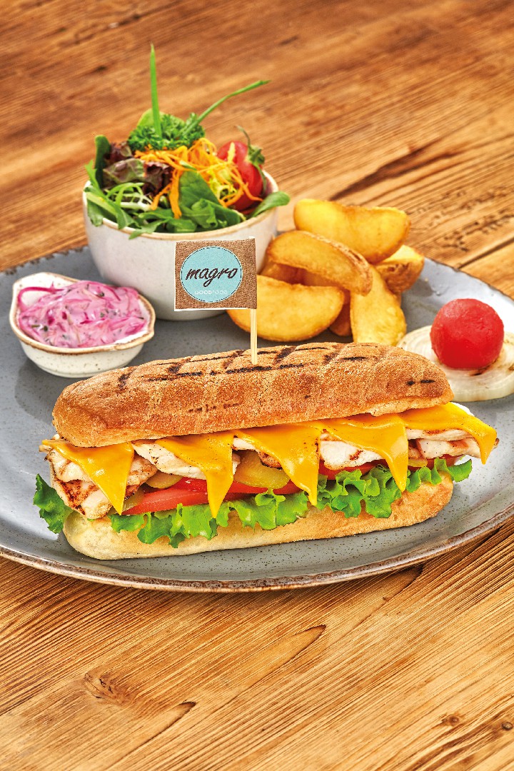 (Panini ekmeği içinde ızgara tavuk parçaları, marul, domates, cheddar peyniri, kızarmış patates ve coleslaw)