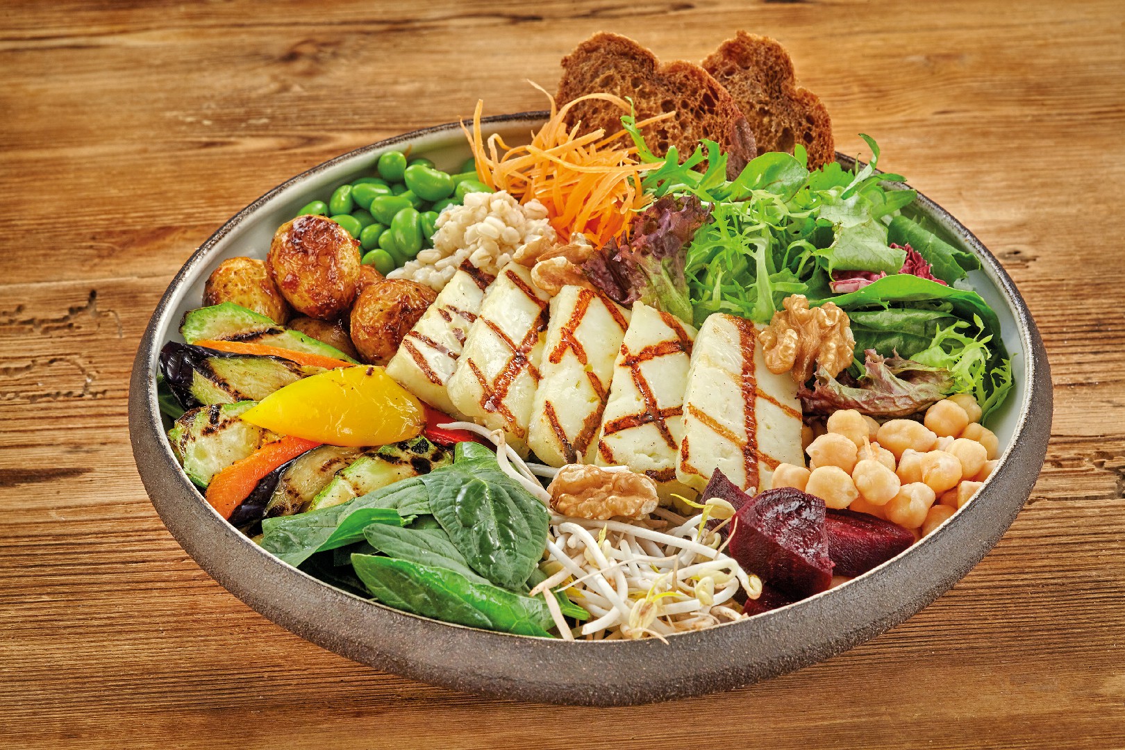 (Izgara kabak, patlıcan, havuç, üç renk biber, baby ıspanak yaprakları, maskolin salata, çıtır havuç, ızgara hellim, baby patates, iç edamame, soya filizi, nohut, ceviz, fırınlanmış pancar, kızarmış ekmek, buğday)