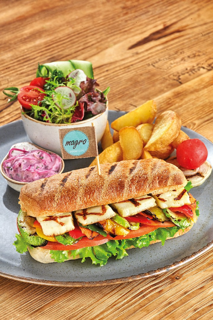 (Panini ekmeği içinde ızgara hellim, kabak, patlıcan, üç renk biber, marul, domates, patates kızartması ve coleslaw)
