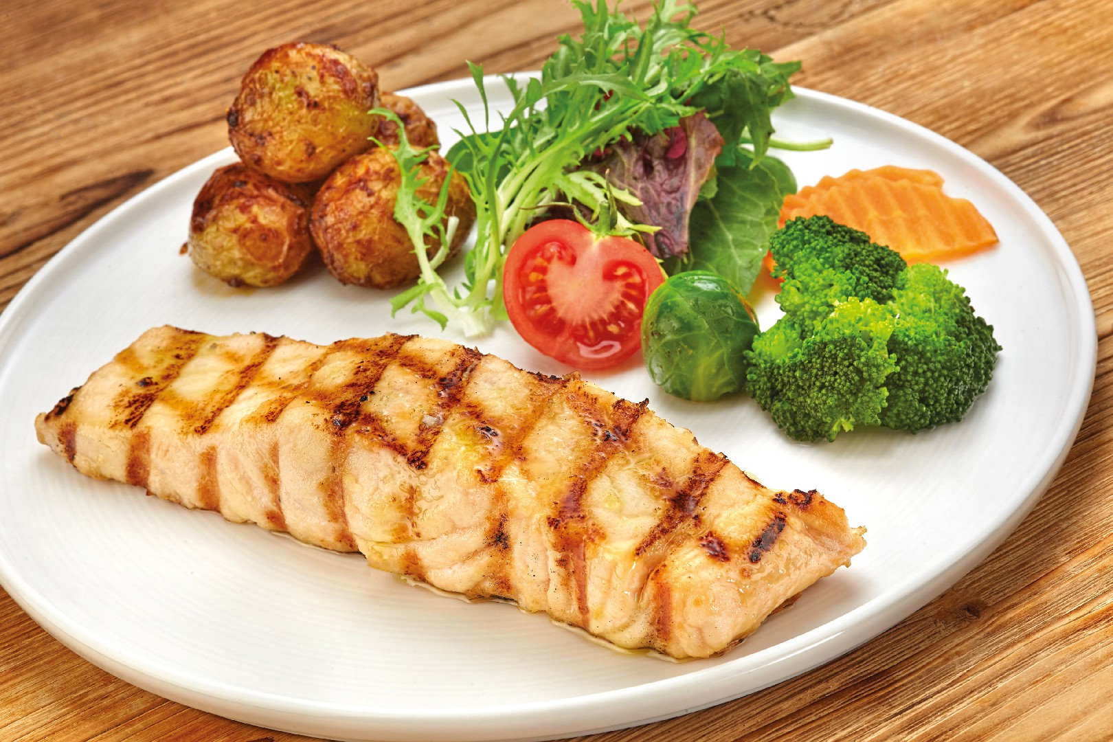 (Zeytinyağı ve taze baharatlar ile dinlendirilmiş, ızgara edilmiş somon filetosu)