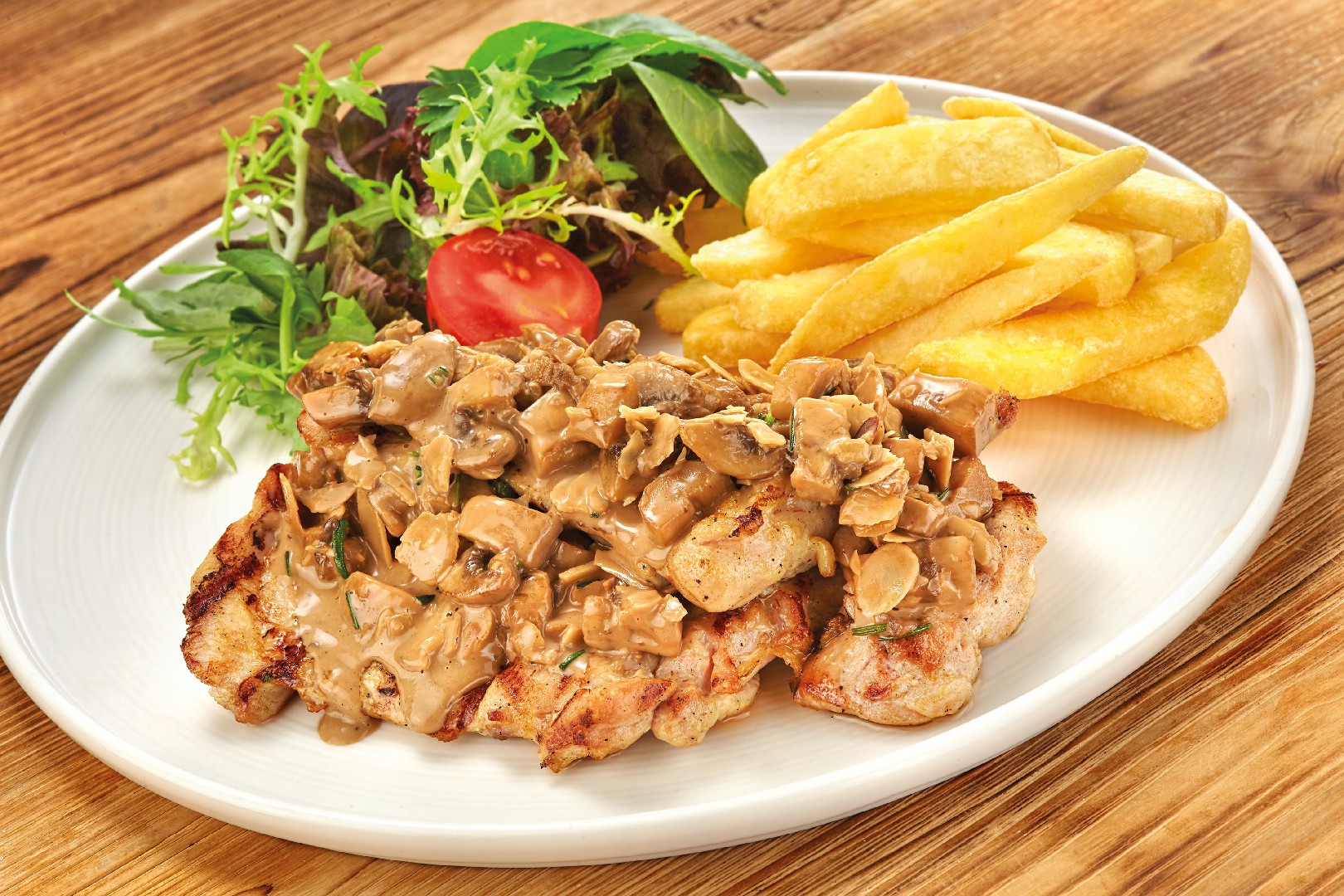 (Izgara tavuk budu üzerinde mantar, badem, krema, soya sos ve taze biberiye)